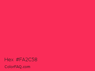 Hex #fa2c58 Color is a normal red color and the nearest color is Radical Red #ff355e. Hex code #fa2c58 and RGB value is rgb(250,44,88). In RGB color space, this color is composed of 98% red, 17% green, 35% blue, In CMYK color space, this color is composed of 0% cyan, 82% magenta, 65% yellow , 2% black , In HSL color space, this color has a hue angle of 347° , 95% saturation and 58% lightness.