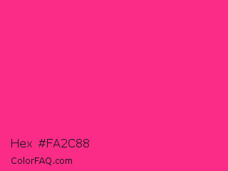 Hex #fa2c88 Color is a normal rose color and the nearest color is Wild Strawberry Crayola #ff3399. Hex code #fa2c88 and RGB value is rgb(250,44,136). In RGB color space, this color is composed of 98% red, 17% green, 53% blue, In CMYK color space, this color is composed of 0% cyan, 82% magenta, 46% yellow , 2% black , In HSL color space, this color has a hue angle of 333° , 95% saturation and 58% lightness.