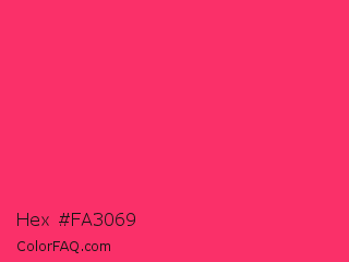 Hex #fa3069 Color is a normal rose color and the nearest color is Radical Red #ff355e. Hex code #fa3069 and RGB value is rgb(250,48,105). In RGB color space, this color is composed of 98% red, 19% green, 41% blue, In CMYK color space, this color is composed of 0% cyan, 81% magenta, 58% yellow , 2% black , In HSL color space, this color has a hue angle of 343° , 95% saturation and 58% lightness.