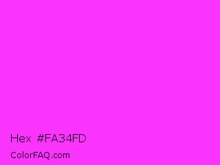 Hex #fa34fd Color is a normal magenta color and the nearest color is Purple Pizzazz #fe4eda. Hex code #fa34fd and RGB value is rgb(250,52,253). In RGB color space, this color is composed of 98% red, 20% green, 99% blue, In CMYK color space, this color is composed of 1% cyan, 79% magenta, 0% yellow , 1% black , In HSL color space, this color has a hue angle of 299° , 98% saturation and 60% lightness.