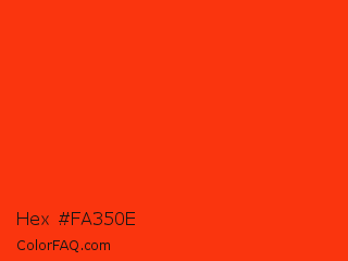 Hex #fa350e Color is a normal red color and the nearest color is Red RYB #fe2712. Hex code #fa350e and RGB value is rgb(250,53,14). In RGB color space, this color is composed of 98% red, 21% green, 5% blue, In CMYK color space, this color is composed of 0% cyan, 79% magenta, 94% yellow , 2% black , In HSL color space, this color has a hue angle of 10° , 96% saturation and 52% lightness.