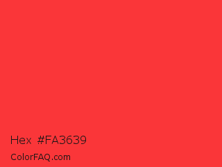 Hex #fa3639 Color is a normal red color and the nearest color is Red Orange #ff3f34. Hex code #fa3639 and RGB value is rgb(250,54,57). In RGB color space, this color is composed of 98% red, 21% green, 22% blue, In CMYK color space, this color is composed of 0% cyan, 78% magenta, 77% yellow , 2% black , In HSL color space, this color has a hue angle of 359° , 95% saturation and 60% lightness.