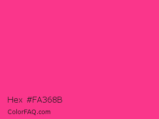 Hex #fa368b Color is a normal rose color and the nearest color is French Fuchsia #fd3f92. Hex code #fa368b and RGB value is rgb(250,54,139). In RGB color space, this color is composed of 98% red, 21% green, 55% blue, In CMYK color space, this color is composed of 0% cyan, 78% magenta, 44% yellow , 2% black , In HSL color space, this color has a hue angle of 334° , 95% saturation and 60% lightness.