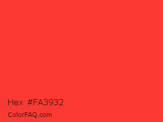 Hex #fa3932 Color is a normal red color and the nearest color is Red Orange #ff3f34. Hex code #fa3932 and RGB value is rgb(250,57,50). In RGB color space, this color is composed of 98% red, 22% green, 20% blue, In CMYK color space, this color is composed of 0% cyan, 77% magenta, 80% yellow , 2% black , In HSL color space, this color has a hue angle of 2° , 95% saturation and 59% lightness.