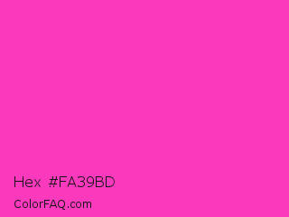 Hex #fa39bd Color is a normal magenta color and the nearest color is Razzle Dazzle Rose #ff33cc. Hex code #fa39bd and RGB value is rgb(250,57,189). In RGB color space, this color is composed of 98% red, 22% green, 74% blue, In CMYK color space, this color is composed of 0% cyan, 77% magenta, 24% yellow , 2% black , In HSL color space, this color has a hue angle of 319° , 95% saturation and 60% lightness.