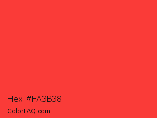 Hex #fa3b38 Color is a normal red color and the nearest color is Red Orange #ff3f34. Hex code #fa3b38 and RGB value is rgb(250,59,56). In RGB color space, this color is composed of 98% red, 23% green, 22% blue, In CMYK color space, this color is composed of 0% cyan, 76% magenta, 78% yellow , 2% black , In HSL color space, this color has a hue angle of 1° , 95% saturation and 60% lightness.