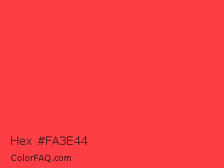 Hex #fa3e44 Color is a light red color and the nearest color is Coral Red #ff4040. Hex code #fa3e44 and RGB value is rgb(250,62,68). In RGB color space, this color is composed of 98% red, 24% green, 27% blue, In CMYK color space, this color is composed of 0% cyan, 75% magenta, 73% yellow , 2% black , In HSL color space, this color has a hue angle of 358° , 95% saturation and 61% lightness.