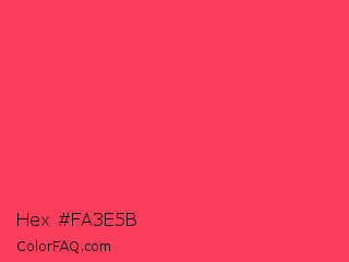 Hex #fa3e5b Color is a light red color and the nearest color is Sizzling Red #ff3855. Hex code #fa3e5b and RGB value is rgb(250,62,91). In RGB color space, this color is composed of 98% red, 24% green, 36% blue, In CMYK color space, this color is composed of 0% cyan, 75% magenta, 64% yellow , 2% black , In HSL color space, this color has a hue angle of 351° , 95% saturation and 61% lightness.