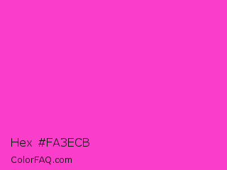 Hex #fa3ecb Color is a light magenta color and the nearest color is Razzle Dazzle Rose #ff33cc. Hex code #fa3ecb and RGB value is rgb(250,62,203). In RGB color space, this color is composed of 98% red, 24% green, 80% blue, In CMYK color space, this color is composed of 0% cyan, 75% magenta, 19% yellow , 2% black , In HSL color space, this color has a hue angle of 315° , 95% saturation and 61% lightness.