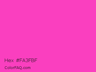 Hex #fa3fbf Color is a light magenta color and the nearest color is Razzle Dazzle Rose #ff33cc. Hex code #fa3fbf and RGB value is rgb(250,63,191). In RGB color space, this color is composed of 98% red, 25% green, 75% blue, In CMYK color space, this color is composed of 0% cyan, 75% magenta, 24% yellow , 2% black , In HSL color space, this color has a hue angle of 319° , 95% saturation and 61% lightness.
