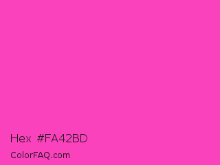 Hex #fa42bd Color is a light magenta color and the nearest color is Razzle Dazzle Rose #ff33cc. Hex code #fa42bd and RGB value is rgb(250,66,189). In RGB color space, this color is composed of 98% red, 26% green, 74% blue, In CMYK color space, this color is composed of 0% cyan, 74% magenta, 24% yellow , 2% black , In HSL color space, this color has a hue angle of 320° , 95% saturation and 62% lightness.
