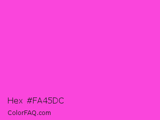 Hex #fa45dc Color is a light magenta color and the nearest color is Purple Pizzazz #fe4eda. Hex code #fa45dc and RGB value is rgb(250,69,220). In RGB color space, this color is composed of 98% red, 27% green, 86% blue, In CMYK color space, this color is composed of 0% cyan, 72% magenta, 12% yellow , 2% black , In HSL color space, this color has a hue angle of 310° , 95% saturation and 63% lightness.