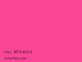 Hex #fa4694 Color is a light rose color and the nearest color is French Fuchsia #fd3f92. Hex code #fa4694 and RGB value is rgb(250,70,148). In RGB color space, this color is composed of 98% red, 27% green, 58% blue, In CMYK color space, this color is composed of 0% cyan, 72% magenta, 41% yellow , 2% black , In HSL color space, this color has a hue angle of 334° , 95% saturation and 63% lightness.