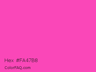 Hex #fa47b8 Color is a light magenta color and the nearest color is Wild Strawberry #ff43a4. Hex code #fa47b8 and RGB value is rgb(250,71,184). In RGB color space, this color is composed of 98% red, 28% green, 72% blue, In CMYK color space, this color is composed of 0% cyan, 72% magenta, 26% yellow , 2% black , In HSL color space, this color has a hue angle of 322° , 95% saturation and 63% lightness.