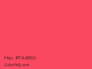 Hex #fa4860 Color is a light red color and the nearest color is Magic Potion #ff4466. Hex code #fa4860 and RGB value is rgb(250,72,96). In RGB color space, this color is composed of 98% red, 28% green, 38% blue, In CMYK color space, this color is composed of 0% cyan, 71% magenta, 62% yellow , 2% black , In HSL color space, this color has a hue angle of 352° , 95% saturation and 63% lightness.
