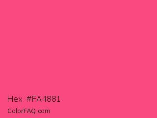 Hex #fa4881 Color is a light rose color and the nearest color is Sasquatch Socks #ff4681. Hex code #fa4881 and RGB value is rgb(250,72,129). In RGB color space, this color is composed of 98% red, 28% green, 51% blue, In CMYK color space, this color is composed of 0% cyan, 71% magenta, 48% yellow , 2% black , In HSL color space, this color has a hue angle of 341° , 95% saturation and 63% lightness.