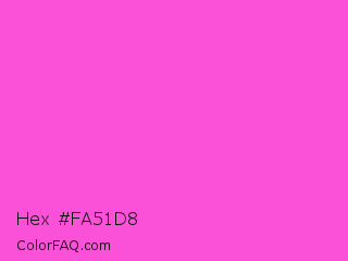 Hex #fa51d8 Color is a light magenta color and the nearest color is Purple Pizzazz #fe4eda. Hex code #fa51d8 and RGB value is rgb(250,81,216). In RGB color space, this color is composed of 98% red, 32% green, 85% blue, In CMYK color space, this color is composed of 0% cyan, 68% magenta, 14% yellow , 2% black , In HSL color space, this color has a hue angle of 312° , 94% saturation and 65% lightness.