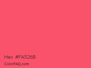 Hex #fa526b Color is a light red color and the nearest color is Fiery Rose #ff5470. Hex code #fa526b and RGB value is rgb(250,82,107). In RGB color space, this color is composed of 98% red, 32% green, 42% blue, In CMYK color space, this color is composed of 0% cyan, 67% magenta, 57% yellow , 2% black , In HSL color space, this color has a hue angle of 351° , 94% saturation and 65% lightness.