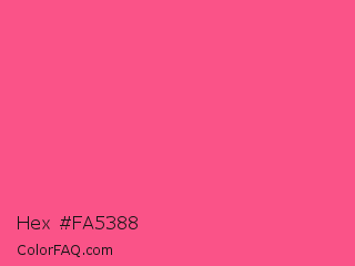 Hex #fa5388 Color is a light rose color and the nearest color is Strawberry #fc5a8d. Hex code #fa5388 and RGB value is rgb(250,83,136). In RGB color space, this color is composed of 98% red, 33% green, 53% blue, In CMYK color space, this color is composed of 0% cyan, 67% magenta, 46% yellow , 2% black , In HSL color space, this color has a hue angle of 341° , 94% saturation and 65% lightness.