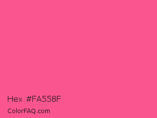 Hex #fa558f Color is a light rose color and the nearest color is Strawberry #fc5a8d. Hex code #fa558f and RGB value is rgb(250,85,143). In RGB color space, this color is composed of 98% red, 33% green, 56% blue, In CMYK color space, this color is composed of 0% cyan, 66% magenta, 43% yellow , 2% black , In HSL color space, this color has a hue angle of 339° , 94% saturation and 66% lightness.