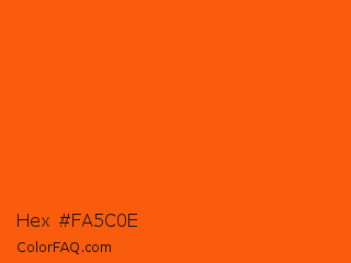 Hex #fa5c0e Color is a normal orange color and the nearest color is Orioles Orange #fb4f14. Hex code #fa5c0e and RGB value is rgb(250,92,14). In RGB color space, this color is composed of 98% red, 36% green, 5% blue, In CMYK color space, this color is composed of 0% cyan, 63% magenta, 94% yellow , 2% black , In HSL color space, this color has a hue angle of 20° , 96% saturation and 52% lightness.