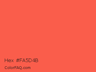 Hex #fa5d4b Color is a light red color and the nearest color is Sunset Orange #fd5e53. Hex code #fa5d4b and RGB value is rgb(250,93,75). In RGB color space, this color is composed of 98% red, 36% green, 29% blue, In CMYK color space, this color is composed of 0% cyan, 63% magenta, 70% yellow , 2% black , In HSL color space, this color has a hue angle of 6° , 95% saturation and 64% lightness.