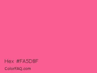 Hex #fa5d8f Color is a light rose color and the nearest color is Strawberry #fc5a8d. Hex code #fa5d8f and RGB value is rgb(250,93,143). In RGB color space, this color is composed of 98% red, 36% green, 56% blue, In CMYK color space, this color is composed of 0% cyan, 63% magenta, 43% yellow , 2% black , In HSL color space, this color has a hue angle of 341° , 94% saturation and 67% lightness.