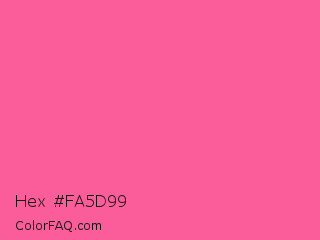 Hex #fa5d99 Color is a light rose color and the nearest color is Violet Red #f75394. Hex code #fa5d99 and RGB value is rgb(250,93,153). In RGB color space, this color is composed of 98% red, 36% green, 60% blue, In CMYK color space, this color is composed of 0% cyan, 63% magenta, 39% yellow , 2% black , In HSL color space, this color has a hue angle of 337° , 94% saturation and 67% lightness.
