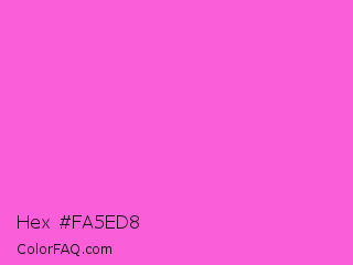 Hex #fa5ed8 Color is a light magenta color and the nearest color is Light Deep Pink #ff5ccd. Hex code #fa5ed8 and RGB value is rgb(250,94,216). In RGB color space, this color is composed of 98% red, 37% green, 85% blue, In CMYK color space, this color is composed of 0% cyan, 62% magenta, 14% yellow , 2% black , In HSL color space, this color has a hue angle of 313° , 94% saturation and 67% lightness.