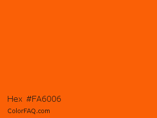 Hex #fa6006 Color is a normal orange color and the nearest color is Vivid Orange #ff5f00. Hex code #fa6006 and RGB value is rgb(250,96,6). In RGB color space, this color is composed of 98% red, 38% green, 2% blue, In CMYK color space, this color is composed of 0% cyan, 62% magenta, 98% yellow , 2% black , In HSL color space, this color has a hue angle of 22° , 96% saturation and 50% lightness.