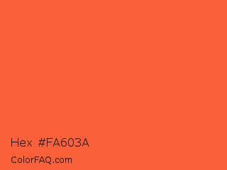 Hex #fa603a Color is a normal red color and the nearest color is Outrageous Orange Crayola #ff6037. Hex code #fa603a and RGB value is rgb(250,96,58). In RGB color space, this color is composed of 98% red, 38% green, 23% blue, In CMYK color space, this color is composed of 0% cyan, 62% magenta, 77% yellow , 2% black , In HSL color space, this color has a hue angle of 12° , 95% saturation and 60% lightness.