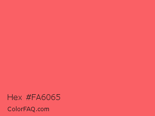 Hex #fa6065 Color is a light red color and the nearest color is Carnation #f95a61. Hex code #fa6065 and RGB value is rgb(250,96,101). In RGB color space, this color is composed of 98% red, 38% green, 40% blue, In CMYK color space, this color is composed of 0% cyan, 62% magenta, 60% yellow , 2% black , In HSL color space, this color has a hue angle of 358° , 94% saturation and 68% lightness.