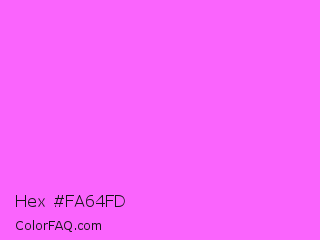 Hex #fa64fd Color is a light magenta color and the nearest color is Pink Flamingo Crayola #ff66ff. Hex code #fa64fd and RGB value is rgb(250,100,253). In RGB color space, this color is composed of 98% red, 39% green, 99% blue, In CMYK color space, this color is composed of 1% cyan, 60% magenta, 0% yellow , 1% black , In HSL color space, this color has a hue angle of 299° , 97% saturation and 69% lightness.