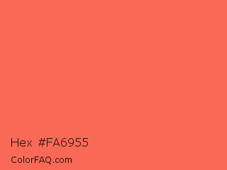 Hex #fa6955 Color is a light red color and the nearest color is Persimmon #ff6b53. Hex code #fa6955 and RGB value is rgb(250,105,85). In RGB color space, this color is composed of 98% red, 41% green, 33% blue, In CMYK color space, this color is composed of 0% cyan, 58% magenta, 66% yellow , 2% black , In HSL color space, this color has a hue angle of 7° , 94% saturation and 66% lightness.