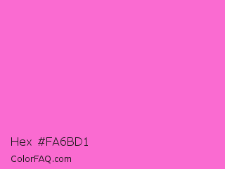 Hex #fa6bd1 Color is a light magenta color and the nearest color is Rose Pink #ff66cc. Hex code #fa6bd1 and RGB value is rgb(250,107,209). In RGB color space, this color is composed of 98% red, 42% green, 82% blue, In CMYK color space, this color is composed of 0% cyan, 57% magenta, 16% yellow , 2% black , In HSL color space, this color has a hue angle of 317° , 93% saturation and 70% lightness.
