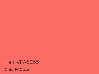 Hex #fa6c65 Color is a light red color and the nearest color is Pastel Red #ff6961. Hex code #fa6c65 and RGB value is rgb(250,108,101). In RGB color space, this color is composed of 98% red, 42% green, 40% blue, In CMYK color space, this color is composed of 0% cyan, 57% magenta, 60% yellow , 2% black , In HSL color space, this color has a hue angle of 3° , 94% saturation and 69% lightness.