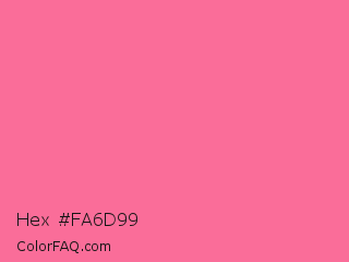Hex #fa6d99 Color is a light rose color and the nearest color is French Pink #fd6c9e. Hex code #fa6d99 and RGB value is rgb(250,109,153). In RGB color space, this color is composed of 98% red, 43% green, 60% blue, In CMYK color space, this color is composed of 0% cyan, 56% magenta, 39% yellow , 2% black , In HSL color space, this color has a hue angle of 341° , 93% saturation and 70% lightness.