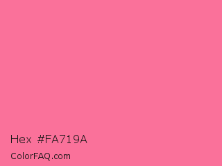 Hex #fa719a Color is a light rose color and the nearest color is French Pink #fd6c9e. Hex code #fa719a and RGB value is rgb(250,113,154). In RGB color space, this color is composed of 98% red, 44% green, 60% blue, In CMYK color space, this color is composed of 0% cyan, 55% magenta, 38% yellow , 2% black , In HSL color space, this color has a hue angle of 342° , 93% saturation and 71% lightness.