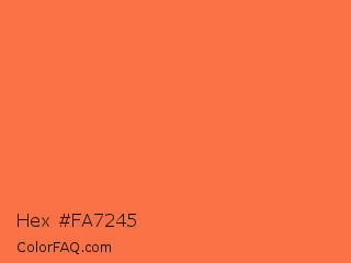Hex #fa7245 Color is a light color and the nearest color is Outrageous Orange #ff6e4a. Hex code #fa7245 and RGB value is rgb(250,114,69). In RGB color space, this color is composed of 98% red, 45% green, 27% blue, In CMYK color space, this color is composed of 0% cyan, 54% magenta, 72% yellow , 2% black , In HSL color space, this color has a hue angle of 15° , 95% saturation and 63% lightness.