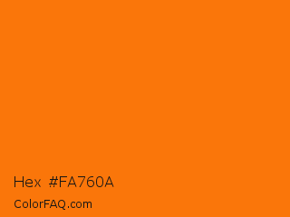 Hex #fa760a Color is a normal orange color and the nearest color is Sorbus #fd7c07. Hex code #fa760a and RGB value is rgb(250,118,10). In RGB color space, this color is composed of 98% red, 46% green, 4% blue, In CMYK color space, this color is composed of 0% cyan, 53% magenta, 96% yellow , 2% black , In HSL color space, this color has a hue angle of 27° , 96% saturation and 51% lightness.