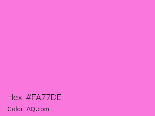 Hex #fa77de Color is a light magenta color and the nearest color is Pale Magenta #f984e5. Hex code #fa77de and RGB value is rgb(250,119,222). In RGB color space, this color is composed of 98% red, 47% green, 87% blue, In CMYK color space, this color is composed of 0% cyan, 52% magenta, 11% yellow , 2% black , In HSL color space, this color has a hue angle of 313° , 93% saturation and 72% lightness.
