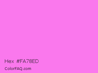 Hex #fa78ed Color is a light magenta color and the nearest color is Light Fuchsia Pink #f984ef. Hex code #fa78ed and RGB value is rgb(250,120,237). In RGB color space, this color is composed of 98% red, 47% green, 93% blue, In CMYK color space, this color is composed of 0% cyan, 52% magenta, 5% yellow , 2% black , In HSL color space, this color has a hue angle of 306° , 93% saturation and 73% lightness.