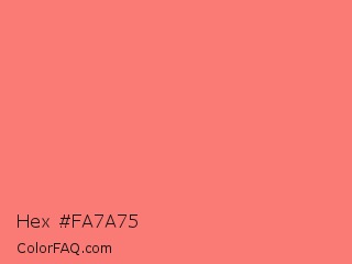 Hex #fa7a75 Color is a light red color and the nearest color is Salmon #fa8072. Hex code #fa7a75 and RGB value is rgb(250,122,117). In RGB color space, this color is composed of 98% red, 48% green, 46% blue, In CMYK color space, this color is composed of 0% cyan, 51% magenta, 53% yellow , 2% black , In HSL color space, this color has a hue angle of 2° , 93% saturation and 72% lightness.