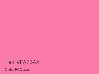 Hex #fa7baa Color is a light rose color and the nearest color is Tickle Me Pink Crayola #fc80a5. Hex code #fa7baa and RGB value is rgb(250,123,170). In RGB color space, this color is composed of 98% red, 48% green, 67% blue, In CMYK color space, this color is composed of 0% cyan, 51% magenta, 32% yellow , 2% black , In HSL color space, this color has a hue angle of 338° , 93% saturation and 73% lightness.