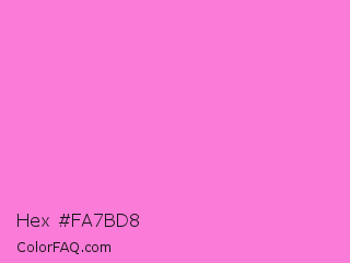 Hex #fa7bd8 Color is a light magenta color and the nearest color is Princess Perfume #ff85cf. Hex code #fa7bd8 and RGB value is rgb(250,123,216). In RGB color space, this color is composed of 98% red, 48% green, 85% blue, In CMYK color space, this color is composed of 0% cyan, 51% magenta, 14% yellow , 2% black , In HSL color space, this color has a hue angle of 316° , 93% saturation and 73% lightness.