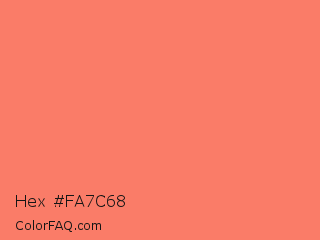Hex #fa7c68 Color is a light red color and the nearest color is Coral Reef Hipster Salmon #fd7c6e. Hex code #fa7c68 and RGB value is rgb(250,124,104). In RGB color space, this color is composed of 98% red, 49% green, 41% blue, In CMYK color space, this color is composed of 0% cyan, 50% magenta, 58% yellow , 2% black , In HSL color space, this color has a hue angle of 8° , 94% saturation and 69% lightness.