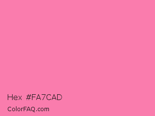 Hex #fa7cad Color is a light rose color and the nearest color is Tickle Me Pink Crayola #fc80a5. Hex code #fa7cad and RGB value is rgb(250,124,173). In RGB color space, this color is composed of 98% red, 49% green, 68% blue, In CMYK color space, this color is composed of 0% cyan, 50% magenta, 31% yellow , 2% black , In HSL color space, this color has a hue angle of 337° , 93% saturation and 73% lightness.