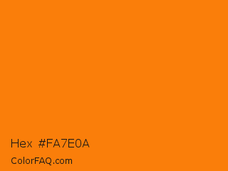 Hex #fa7e0a Color is a normal orange color and the nearest color is Sorbus #fd7c07. Hex code #fa7e0a and RGB value is rgb(250,126,10). In RGB color space, this color is composed of 98% red, 49% green, 4% blue, In CMYK color space, this color is composed of 0% cyan, 50% magenta, 96% yellow , 2% black , In HSL color space, this color has a hue angle of 29° , 96% saturation and 51% lightness.
