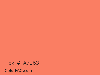 Hex #fa7e63 Color is a light red color and the nearest color is Coral Reef Hipster Salmon #fd7c6e. Hex code #fa7e63 and RGB value is rgb(250,126,99). In RGB color space, this color is composed of 98% red, 49% green, 39% blue, In CMYK color space, this color is composed of 0% cyan, 50% magenta, 60% yellow , 2% black , In HSL color space, this color has a hue angle of 11° , 94% saturation and 68% lightness.