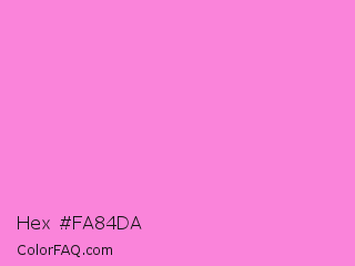 Hex #fa84da Color is a light magenta color and the nearest color is Pale Magenta #f984e5. Hex code #fa84da and RGB value is rgb(250,132,218). In RGB color space, this color is composed of 98% red, 52% green, 85% blue, In CMYK color space, this color is composed of 0% cyan, 47% magenta, 13% yellow , 2% black , In HSL color space, this color has a hue angle of 316° , 92% saturation and 75% lightness.